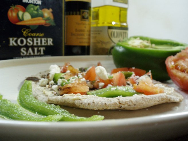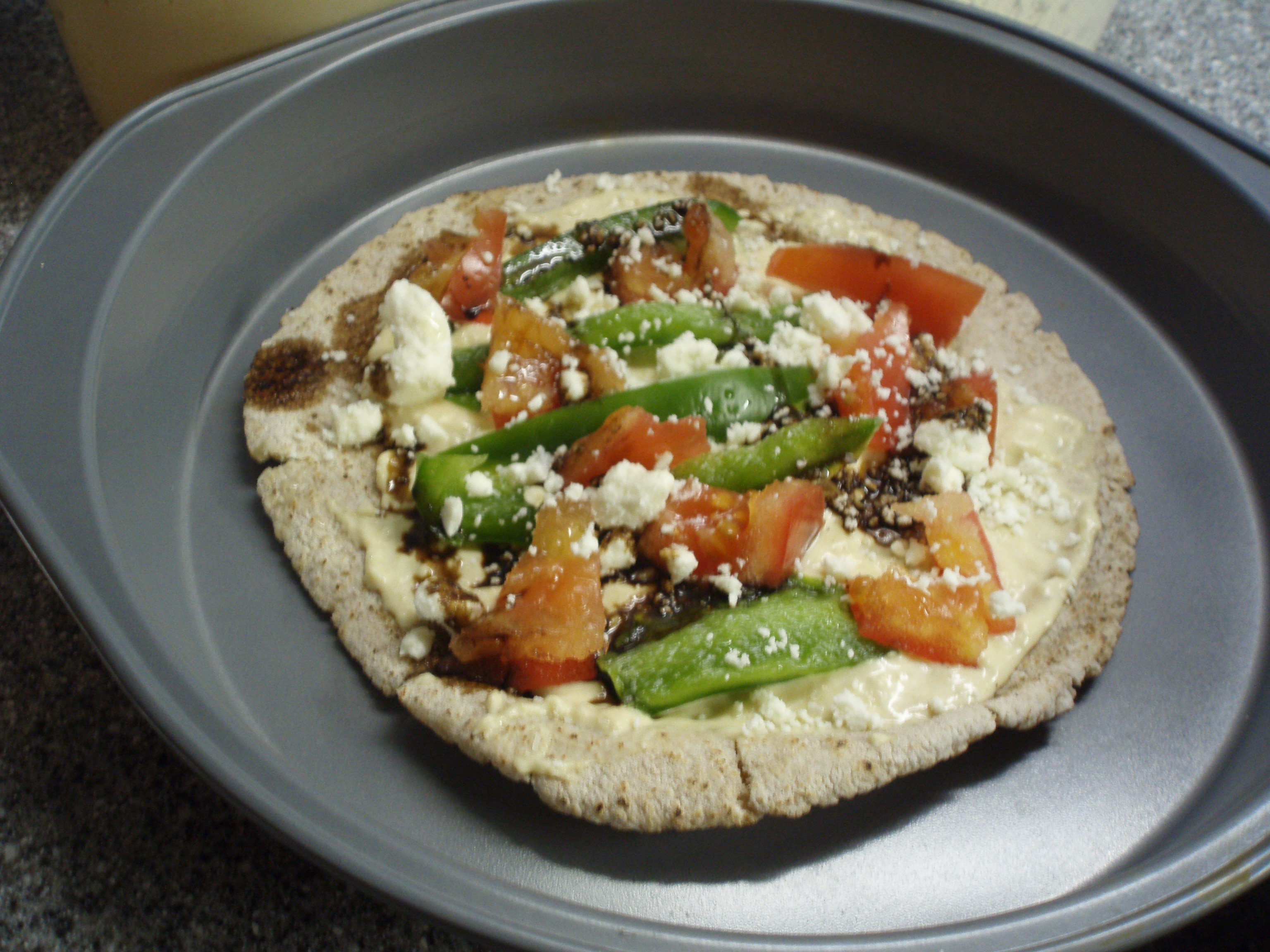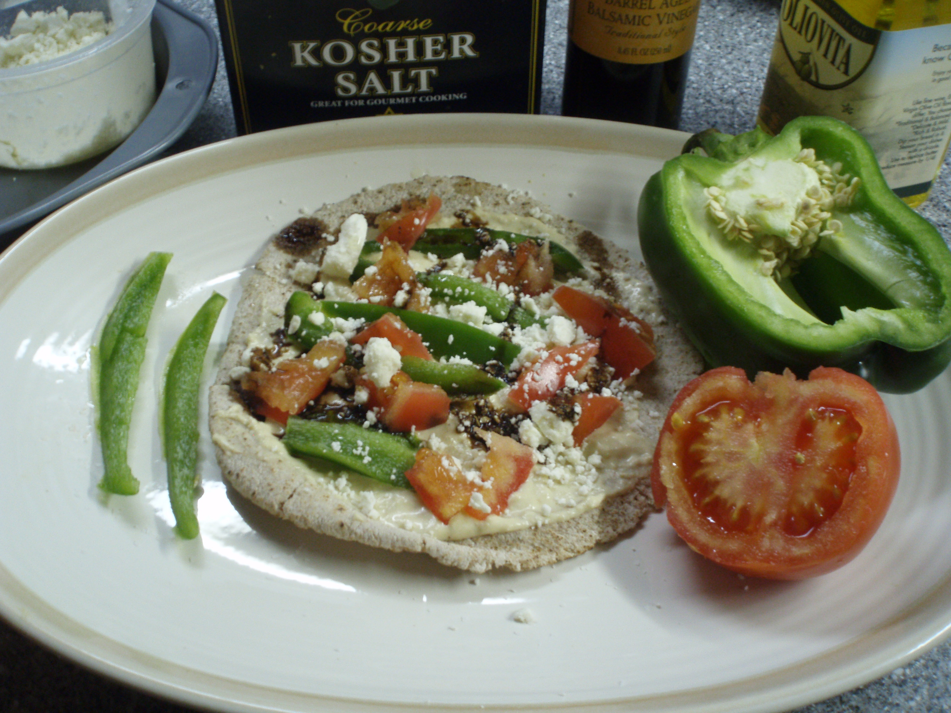 Pita, Humus (base), Green Peppers, Vine Tomatoes, Feta, Balsamic Vinegar, EVOO, Kosher Salt.  Bake until warm and pita is slightly crunchy. Or eat raw. So good.  Everything but the feta, vinegar, olive oil, and salt was purchased same-day at the Allentown Farmers Market.  Not pictured: a side of green pepper slices and tomato wedges (left over from making toppings)  for dipping in cold humus.