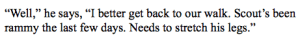 Earlier this morning, I came home from a jaunt outside to find my own dog clearly wanting a walk. It’s icy and raining here. My coat and shoes were off. Then I took a look at what he’d brought me immediately after sensing this thing might not go his way. It was a typed of piece paper. The final line of the page?