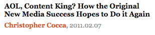 Now that AOL is primarily a content company focusing on intelligent, agenda-setting media, it’s recapturing a bit of its old time portal chutzpah. No longer simply a desktop service or even just one extremely useful website, AOL is looking to become, once more, a community where people want to be. Fifteen years ago, AOL was the most successful online Third Place because the nascent social web was about instant messaging in a safe, intuitive environment. With a new focus on bringing together the best digital content and discussion, AOL is reapplying for the job of world’s biggest internet brand. As a communications tool and packaged online experience, AOL was once the place to be. Can its new focus on content, content, content, make it that again? AOL is betting that it can, and betting big. It’s not a bad position. After all, without compelling things to share, what’s the fun of social networks? I don’t care (that much) about what you had for breakfast. I do care, though, about good stories, cogent insight, and the frenetic cycling of news, and I’m not alone.