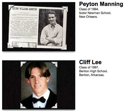 This image is via Yahoo!Sports. Peyton Manning, you look exactly the same. Cliff Lee, how is it possible that you were a teenager at precisely the same time I was? It’s not that you look old now…it’s just that you’re so talented, I assume you’ve been pitching since the dead-ball era.