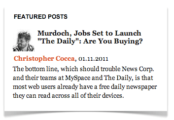My first post for Huffington’s media section is featured today on the site. It picks up from yesterday’s post on this blog, but considers News Corp.’s “Daily” move in conjunction with yesterday’s announcement of a %47 layoff at subsidiary MySpace. Click the image to read, and please do comment. Thanks!